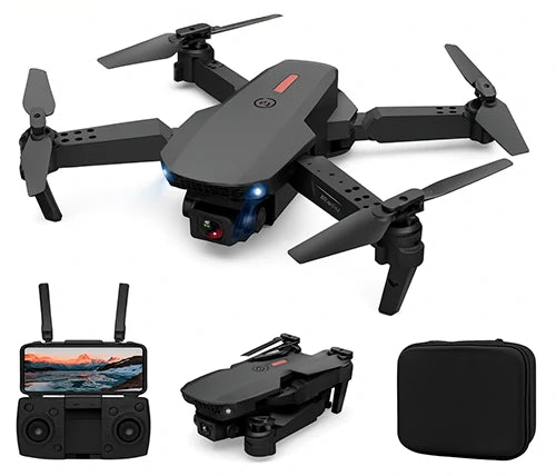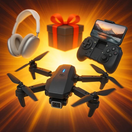 VisionFly 4K drón, távirányító, hordtáska, szürke zajszűrős fejhallgató és egy meglepetés ajándék.